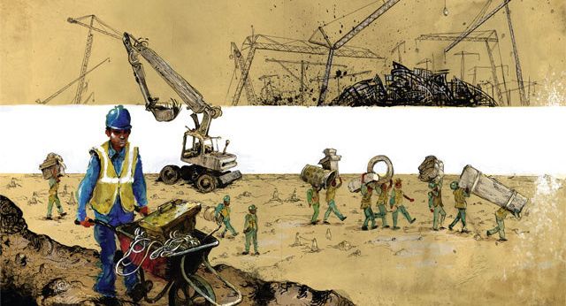 On the coast of Abu Dhabi, gilded outposts of the Louvre, the Guggenheim, and New York University are being built by foreign workers who cannot leave and are paid half of what they were promised.